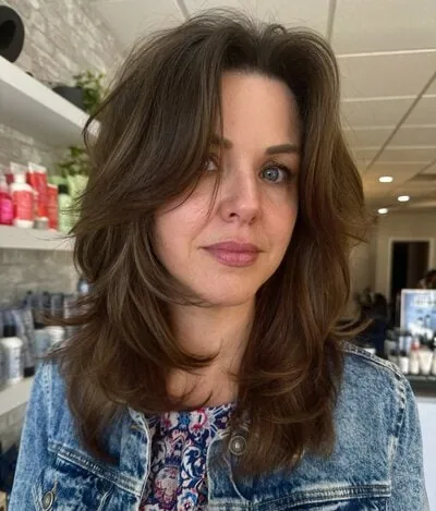 Žena s duguljastim licem i dugim slojevitim lobom s curtain šiškama, frizura koja uravnotežuje proporcije lica