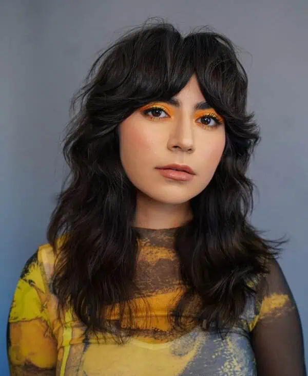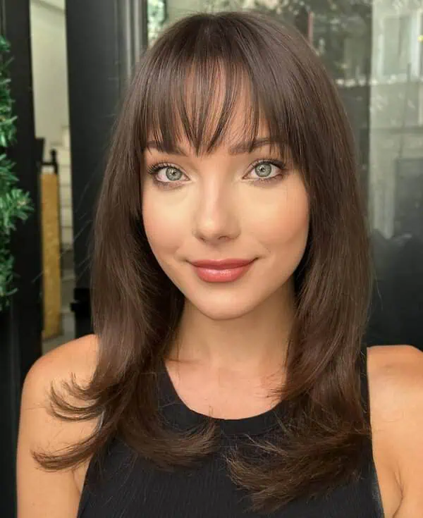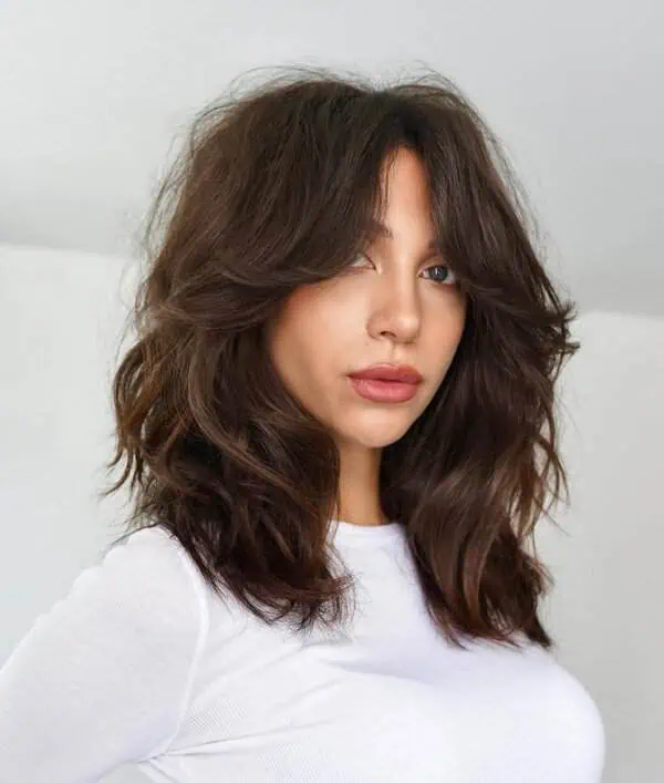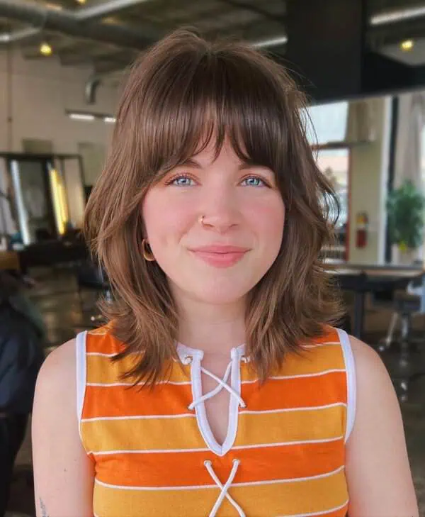 Stepenasto ošišan shag s dužinom do ramena i laganim šiškama dodaje teksturu i pokret. Frizura daje mladenački, opušten izgled i savršen je izbor za one koje žele više volumena i dinamike.