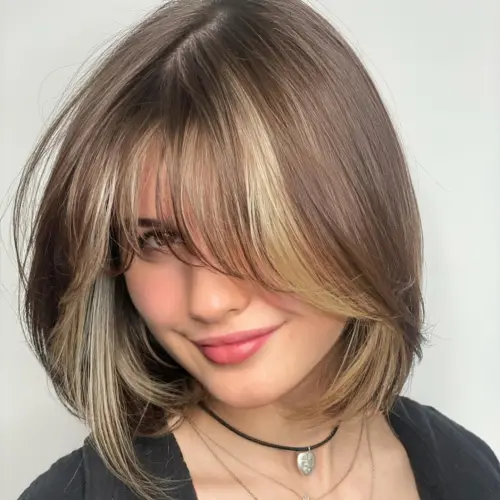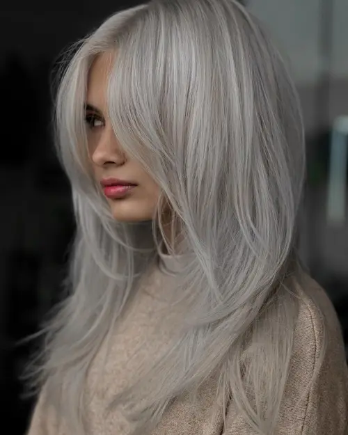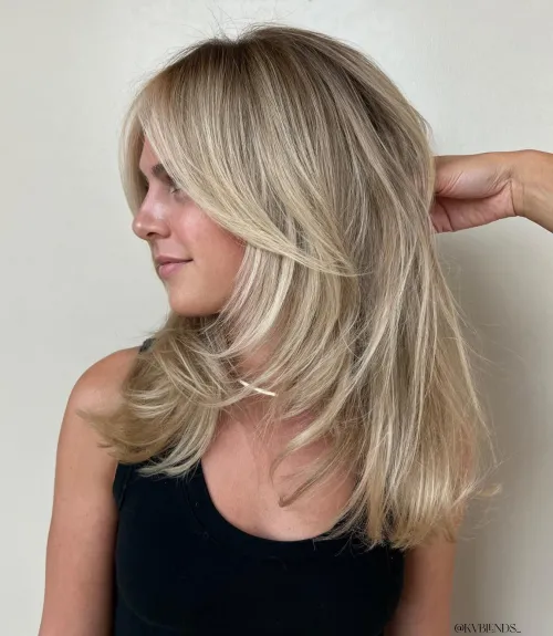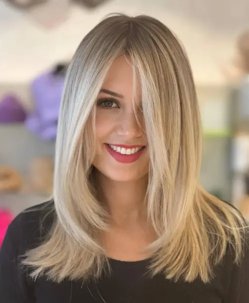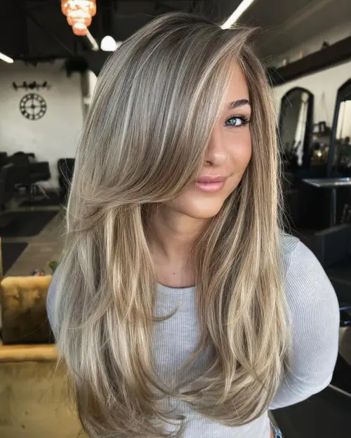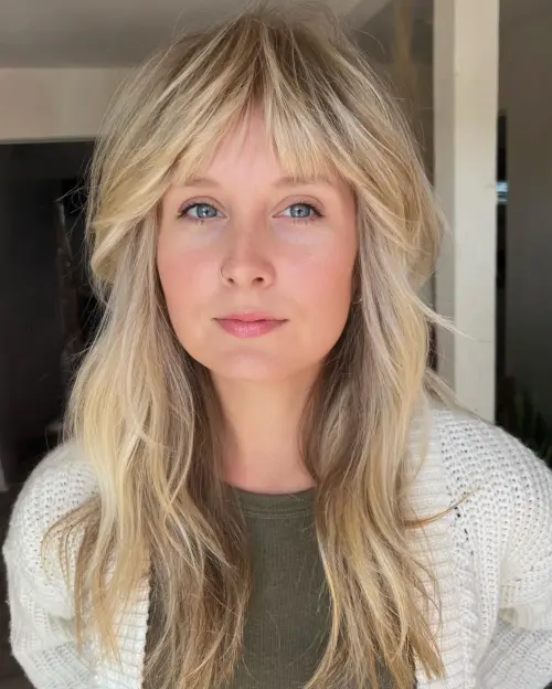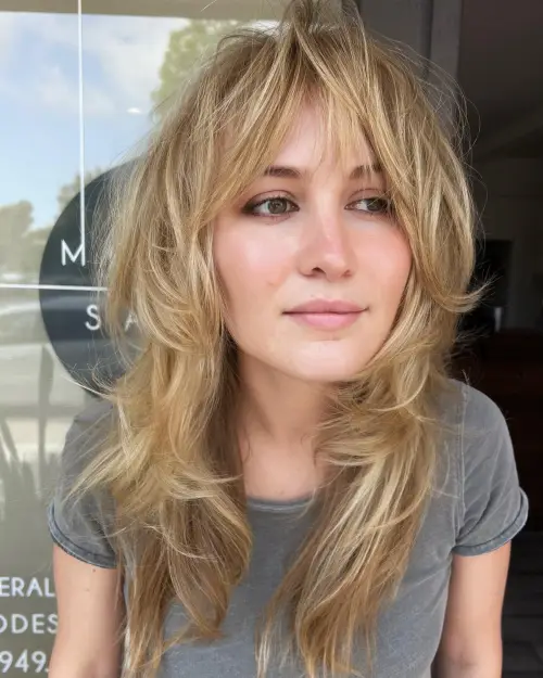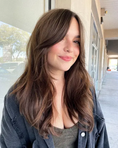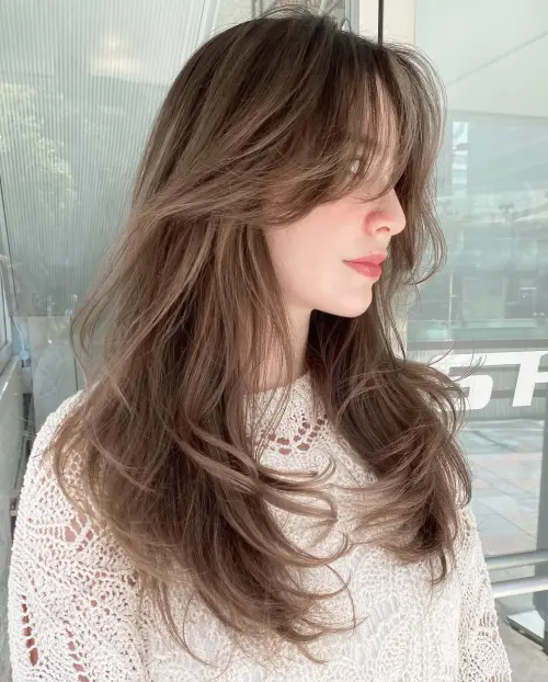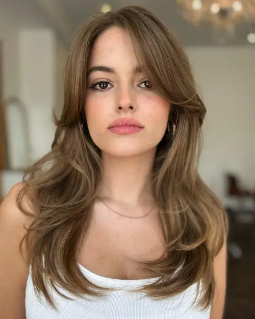 Duga slojevita frizura sa stranim šiškama koja stvara prirodan volumen i lakoću.