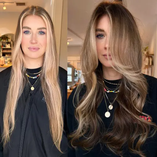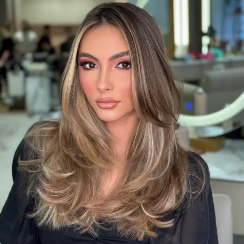 Duga frizura s mekim slojevima i balayage pramenovima za prirodan volumen.