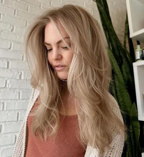 Za dugu tanku kosu savršen je izbor višeslojna frizura u toplim medenim tonovima s prirodnim pramenovima. Mekani slojevi dodaju dimenziju, dok suhi šampon daje osjećaj veće gustoće. Za dodatnu punoću, lagano natapiraj kosu pri korijenu i osvježi volumen i tjednima nakon šišanja.