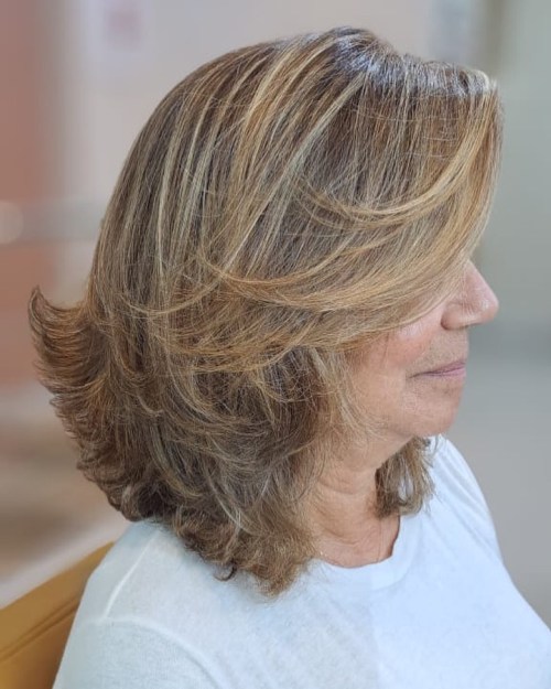 Srednje duga frizura s izraženim perjastim slojevima za volumen i elegantan izgled nakon 50. godine.